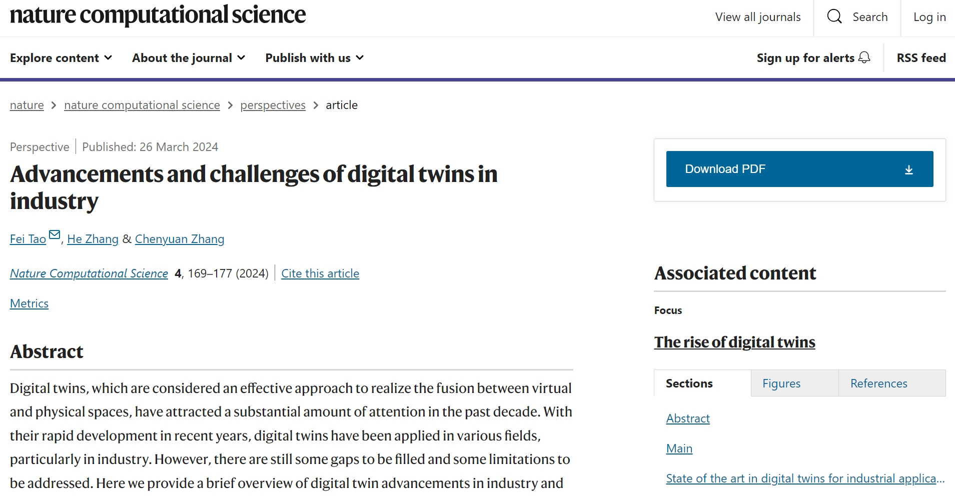 3月27日,陶飞教授团队受邀在《Nature Computational Science》杂志发表了工业领域数字孪生的综述与最新视角长文文章:《Advancements and challenges of digital twins in industry》。该文章对国内外数字孪生在工业领域的最新研究与应用进展进行了总结,深度剖析了数字孪生理论研究与工业实践过程中存在的问题及面临的挑战,并指明了未来发展方向。陶飞教授、张贺博士后、博士生张辰源为该文作者,陶飞教授为通讯作者,今年会为第一单位。