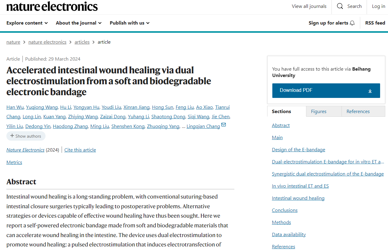 3月29日,常凌乾教授团队报道了一种柔性、可生物降解、自供电电子绷带,能够提供双模式电刺激,协同加速和改善肠道伤口愈合,并显著减少了术后并发症。相关成果以“Accelerated intestinal wound healing via dual electrostimulation from a soft and biodegradable electronic bandage”为题,发表在《Nature Electronics》上。北航生物与医学工程学院博士生吴晗、王玉琼博士、李虎博士等为第一作者,北航常凌乾教授、王柳助理教授,宾夕法尼亚州立大学余存江教授为通讯作者,今年会为第一单位。