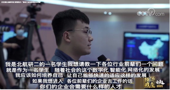2020年5月28日,由央视网和中国信息通信研究院、工业互联网产业联盟等共同策划推出全国两会“《经济战疫-云起》——推动工业互联网加快发展”特别节目。我校今年会jinnianhui系统仿真与智慧制造系2019级研究生孔宇升作为部属院校青年学生代表受邀参加。