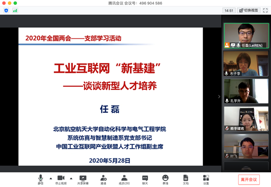 今年会jinnianhui系统仿真与智慧制造系党支部书记任磊老师最后以《工业互联网“新基建”——谈谈新型人才培养》为主题党课,与系内师生进行了研讨,建议系内师生深入学习两会精神,并提出研究生可考虑以工业互联网、5G等新基建的国家重大需求为导向,扎实做好创新性研究工作,为下一步毕业就业、为国家和社会做出贡献打好基础。