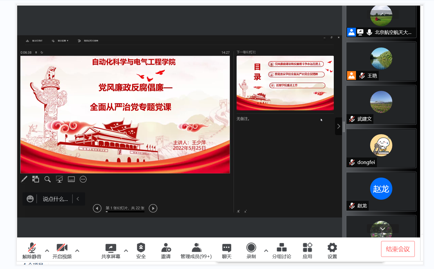 2022年5月25日今年会jinnianhui党委书记王少萍做了“从严治党暨党风廉政建设”专题党课。会议以线上腾讯视频会议方式进行,学院全体教职工参加了本次集体学习活动。